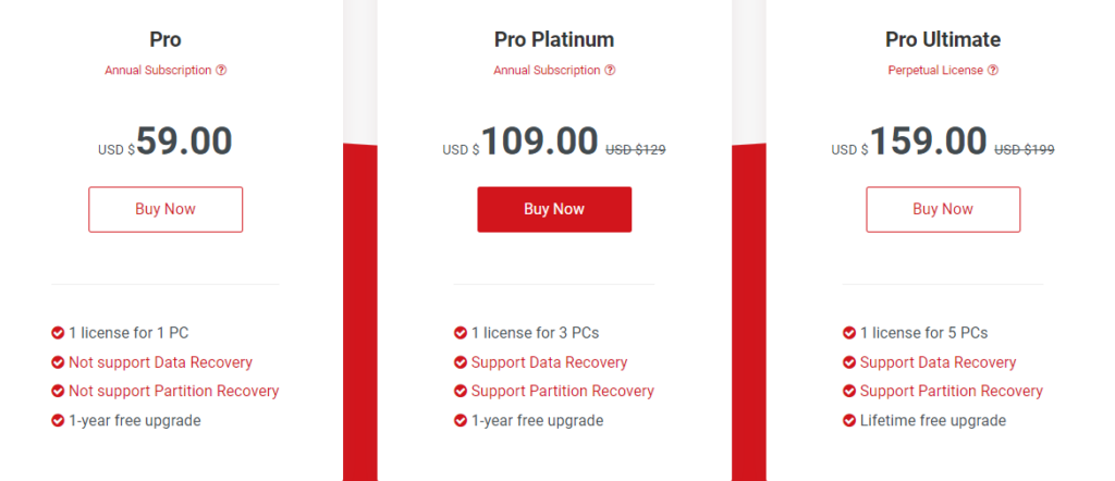The annual subscription for the Pro Platinum version is USD 129, and it provides a license for three PCs. It even includes a free one-year update and supports data and partition recovery.
